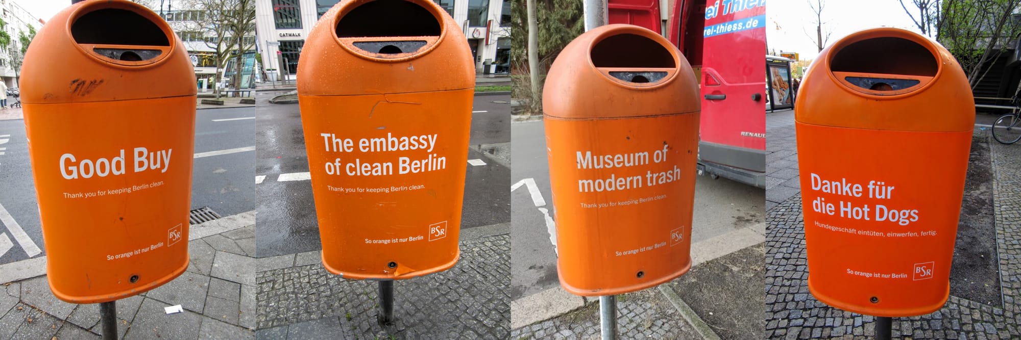 I just came back from Berlin, and there, throughout the city, these little orange hanging trashcans are scattered. Hundreds of them, and until now, I never realized how helpful they had been throughout my travels. I never realized how these small little orange sirens, with their constant subtle call catering to our better demons, beckoned surrounding trash to them.